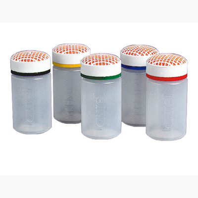 Transparente Wasserflasche, 0,16 Liter aus Polyethylen (PE). Verteilerschwamm aus Naturkautschuk. Kappe weiß, mit farbigem Ring. Ersatzkappe auch einzeln lieferbar (EDV-Nr. 12610). Größe: 38x80mm.