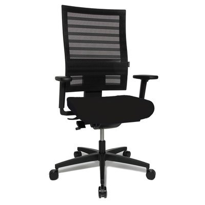 Polyamidfußkreuz schwarz ausgerüstet mit lastabhängig gebremsten Sicherheitsdoppelrollen für Hartböden (weiße Rollen). Rückenlehne über Rastermechanik höhenverstellbar. Stoff-Farbe: schwarz / Netzrücken schwarz.