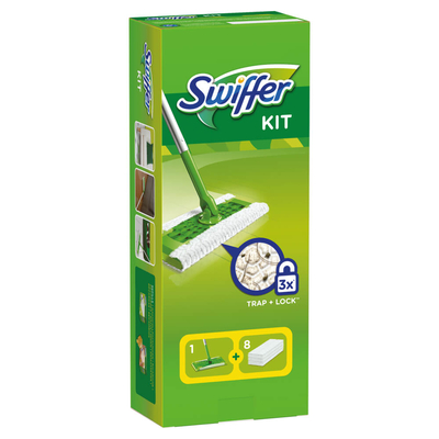 Swiffer KIT SW9871 - Systemstarter bestehend aus 1 Bodenwischer und 8 Boden-Staubtüchern mit elektrostatischer Wirkung und spezieller 3D-Struktur, die Staub und Haare sogar in Fugen bindet. Der Bodenwischer kann mit verschiedenen Tüchern für unterschiedliche Einsatzgebiete verwendet werden. Es werden keine weiteren Reinigungsmittel benötigt. Ausführung: Stiel (1,20m lang) mit 360-Grad-Drehkopf für schwer erreichbare Stellen, Tuchhalterung. Passende Wischtücher für unterschiedliche Anwendungen gleich mitbestellen: Holz & Parkett (Best.-Nr. 2754), und Feucht-Wischtücher mit Citrusduft (Best.-Nr.10425). Bitte beachten Sie die vollständigen Anwendungshinweise auf der Verpackung.