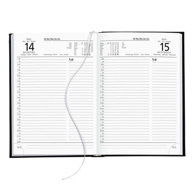 Ausführung: Sonn- und Feiertage hervorgehoben, Samstag und Sonntag jeweils auf einer Seite, Tageszählung, Monatsübersicht vor einem neuen Monat, Lesezeichenband, Feiertage Deutschland, Ferientermine, Adressenverzeichnis.