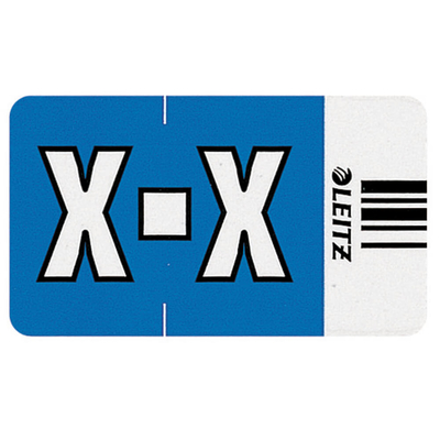 Leitz Orgacolor selbstklebende Buchstabensignale 6633-10. Mit dem Orgacolor-Kennzeichnungssystem werden die Akten durch ein Farbcode-System in einen für den Betrachter unverwechselbare Reihenfolge gebracht. Aufdruck: X, Farbe: dunkelblau, Inhalt je Packung: 250 Stück auf Rolle. Ausführung: selbstklebend auf Trägerbandrolle in Ausgabeschachtel, verblassen nicht und greifen sich nicht ab, Signal mit Strichcode auf der Innenseite. 28 Buchstaben mit 15 unterschiedlichen Farben: A-M in 13 verschiedenen Farben. N-Z in denselben Farben, jedoch mit zusätzlicher Balkenmarkierung. SCH, ST in 2 Zusatzfarben. Die Farben entsprechen dem IFOSA-Farbschlüssel.