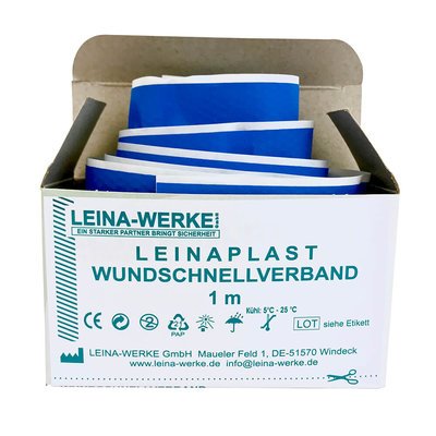 Leina-Werke LEINAPLAST Wundschnellverband WF BLAU. Maße: 1 m x 6 cm, Farbe: blau. Ausführung: wasserfest, elastisch, detektierbar dank integrierter Aluminiumstreifen, wasser- und schmutzabweisend. Verpackung: Faltschachtel.