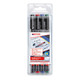 Edding Folienschreiber 141F im 4er Etui zum feinen permanenten Schreiben auf fast allen geschlossenen Kunststoffoberflächen wie Overheadfolien, Klarsichthüllen, Kunststoffheftern oder Glas und anderen glatten Oberflächen. Strichbreite: ca. 0,6mm/F, wasserfest, Spitze: metallgefaßte Rundspitze, Tinte: wisch- und wasserfest (mit Alkohol korrigierbar), schnelltrocknend, geruchsarm. Ausführung: die Kappe kann am Ende des Schafts aufbewahrt werden, um das Risiko des Verlusts zu vermeiden, der praktische Clip verhindert das Wegrollen und kann an Kleidung und Gegenständen befestigt werden. Etui mit den Farben: rot, blau, grün und schwarz.