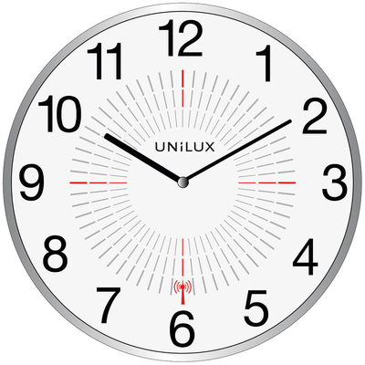 Unilux Funkuhr Outdoor 400094566 mit analoger Zeitanzeige für drinnen und draußen mit hoher Präzision dank funkgesteuerter Technik. Die Uhr wird automatisch und permanent mit Radiowellen von der Mainflinger Atomuhr eingestellt. Dank des großen Durchmessers kann die Uhr auch bei großem Abstand gelesen werden. Variante: Wanduhr, Betriebsart: Funk, Display: analog, Maße: 35,5cm Durchmesser und 6cm Tiefe, Ziffernblatt: weiß, arabische Zahlen (schwarz), Gehäusefarbe: metallgrau, Material: Aluminium (Gehäuse) und Glas (Abdeckung), Stromversorgung: 1 x 1,5 V AA-Mignon-Batterie (nicht im Lieferumfang enthalten), Gewicht: 790g, Farbe: metallgrau. Ausführung: schwarze Schrift auf weißem Grund, arabische Ziffern, rote Orientierungslinien für größere Entfernungen, wasserdicht, stille Zeigerbewegung. Herstellergarantie: 2 Jahre.
