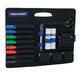 magnetoplan Moderatorentaschen Messenger - praktische Tragetaschen inklusive herausnehmbarem Kit mit fest fixiertem Moderations-Zubehör. Die komfortable, kompakte + universell einsetzbare Alternative zu herkömmlichen Moderationskoffern. Über 1.300 Einzelteile für bis zu 8 Teilnehmer. Inhalt: 8 Board-/Flipchartmarker PRO+ (je 2x rot, blau, grün, schwarz), 1 Cutter (Klingenbreite 9mm), 1 Papierschere (6 Zoll), 2 Klebestifte (20g), 1 Klebefilm-Handabroller (inkl. 1 Klebefilmrolle 50m x 19mm), 300 Pinnnadeln (je 100x rot, blau, grün), 500 Kommunikationskarten rund (Durchmesser 100mm, 6-farbig sortiert), 250 Kommunikationskarten rechteckig (200 x 100mm, 6-farbig sortiert) und 250 Kommunikationskarten oval (190 x 110mm, 6-farbig sortiert). Ausführung Tasche: abwaschbar, strapazierfähig, abgestepptes dunkelblaues Innenfutter, großzügige Fronttasche inklusive Reißverschluss, verstellbarer schwarzer Tragegurt inklusive praktischem Klemmverschluss, verstellbare Taschentiefe, gepolsterte Laptop-Innentasche, Haltegurt zur Trolley-Befestigung. Maße: 410 x 350 x 120 mm, Material: Polyestergewebe, Gewicht: 2,5 kg, Farbe: schwarz.