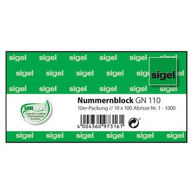 Sigel Nummernblocks GN110 sind praktisch für viele Gelegenheiten - z.B. als Garderobennummer, Kuchenblock oder für Verlosungen. Maße: 105x50mm, Packung: 10 Block à 100 Blatt. Ausführung: fortlaufend nummeriert von 1-1000, jeder Block enthält je 100 Nummern, hervorragende Schnitt-Steg-Perforationen. Zertifikate: FSC-zertifiziert.