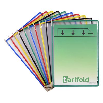 tarifold Drehzapfensichttafeln 114009 mit voll umlaufendem, farbigen Metall-Rahmen. Format: DIN A4, Material: entspiegelte, körnige PVC-Folie mit Metalldrehzapfen, Farbe: sortiert. Ausführung: mit 5 Aufsteckreitern 50mm (A4/A3) zur Kennzeichnung der Sichttafeln. Öffnung an der kurzen oder an der langen Seiten - Karton neutral. Für alle Trägersysteme (Wand-, Tisch-, Drehsysteme).