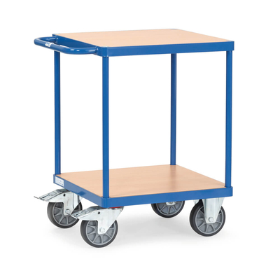 Fetra schwere Tischwagen 2496 mit 2 Böden und quadratischer Ladefläche. Tragkraft: 500kg (obere Ladefläche max. 200kg), Ladefläche: 600x600mm (LxB), Ladeflächenhöhe: 228mm und 860mm, Außenmaße: 737x609x860mm (LxBxH), Material: Stahlrohr und Profilstahl geschweißt, pulverbeschichtet blau RAL 5007, Bereifung: TPE-Reifen (160x40), Gewicht: 37kg. Ausführung: jeweils 2 Bock- und Lenkrollen, Feststeller an den Lenkrollen (gemäß EN 1757-3), Böden aus Holzwerkstoffplatte (Oberfläche Buchendekor), Naben mit Rillenkugellager. 10 Jahre Herstellergarantie - Made in Germany.