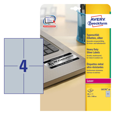 Avery Zweckform strapazierfähige Typenschild-Etiketten L6134-20 auf A4-Blättern eignen sich ideal zur professionellen Inventar- und Eigentumskennzeichnung sowie für Piktogramme im Innen- und Außenbereich. Maße: 105,0x148,0mm, Material: Polyester-Folie, Farbe: silber, Oberfläche: matt, Klebung: selbstklebend (permanent haftend), Etiketten je Packung: 80 Stück, Blatt je Packung 20 Bogen DIN A4 (4 Stück je Blatt), geeignet für Druckertyp: Laser s/w, Umweltaspekt: klimaneutrales Produkt, PVC-frei, Made in Germany. Ausführung: rechteckig mit abgerundeten Ecken, extrem strapazierfähig, wetterfest, öl-, schmutz-, UV- und temperaturbeständig (von -40 bis +150 Grad Celsius), wasser- und reißfest, abwaschbar, gestochen scharfes Druckbild ohne Verwischen, garantiert staufreier Druckerdurchlauf ohne Klebstoffablagerungen.
