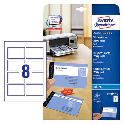 Avery Zweckform Classic PC-bedruckbare Visitenkarten C32015-10 auf A4-Bogen sind ideal zum Selbstgestalten Ihrer individuellen Visitenkarten. Wenn Sie schnell neue Visitenkarten brauchen, drucken Sie sie doch einfach mal selbst, die Vorteile werden Sie überzeugen: Sofortige Verfügbarkeit, keine Wartezeiten bei der Druckerei, Druck von bedarfsgerechten Auflagen sogar in kleinen Stückzahlen und die Möglichkeit von flexiblen und schnellen Aktualisierungen. Und das alles in einer hochwertigen und professionellen Drucker-Qualität! Maße: 85 x 54mm, Farbe: weiß, Material: Karton, Grammatur: 260 g/m², Oberfläche: beidseitig matt, geeignet für Druckertyp: Inkjet, Umweltaspekt: chlorfrei gebleicht. Ausführung: rechteckig, beidseitig bedruckbar, extrafeine Mikroperforation zum leichten Heraustrennen. Inhalt: 80 Karten / 10 DIN A4 Bogen (10 Stück je Blatt).