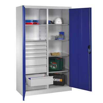 CP Werkzeugschränke 8931-305 der Serie 89 mit Schubladen und Fächern zur Aufbewahrung unterschiedlichster Materialien. Außenmaße: 1200x1950x500mm (BxHxT), Innenmaße: 1198x1840x453mm (BxHxT), Anzahl Einlegeböden: 6, Traglast je Boden: 70 kg, Traglast Schrank: 450 kg, Anzahl Fächer: 7, Anzahl Schubladen: 8, Türen: 2 Flügeltüren, abschließbar: Ja, Verschluss: Mulden-Griffschloss Ergo-Lock 4.0 mit 3-Riegel-Verschluss und bester Bedienungssicherheit, Material: Stahl, Gewicht: ca. 135 kg, Farbe Korpus: Lichtgrau (RAL 7035). Ausführung: Mitteltrennwand, links 4 kleine und 4 große Schubladen (Traglast ca. 30 kg), 2 Böden und 2 Fächer, rechts 4 Böden und 5 Fächer, 2 Flügeltüren zueinanderschlagend für gemeinsamen Verschluss, oben und unten in Drehbolzen gelagert, Öffnungswinkel ca. 110 Grad, verzinkte Einlegeböden höhenverstellbar (15mm-Raster), Zylinderschloss (2 Schlüssel). Lieferzustand: komplett vormontiert.